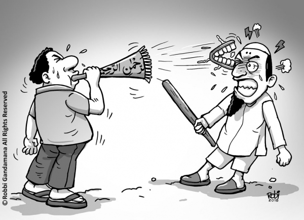 "Tuhan nggak perlu dibela..!", begitu kata Gus Dur suatu kali (yang sekaligus jadi judul buku beliau). Tuhan punya bala tentara sendiri atau bahkan tanpa bala tentara pun Tuhan akan dengan mudah menghancurkan musuhnya atau siapa pun yang membangkang. Dengan sekali tunjuk para pembangkang bisa berubah jadi Sponge Bob.
